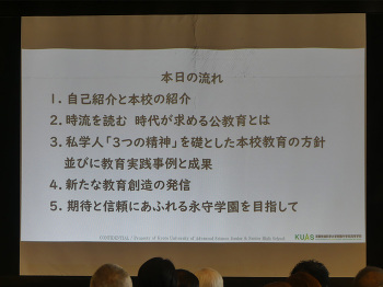 当日は、日私学保連・鹿濱德雄会長の挨拶、続いて京都府・寺田崇雄会長の歓迎の挨拶をいただいた後、第1部では京都先端科学大学附属中学高等学校校長・佐々井宏平先生による講演が行われ、第2部では西本願寺の参拝・拝観が実施された。